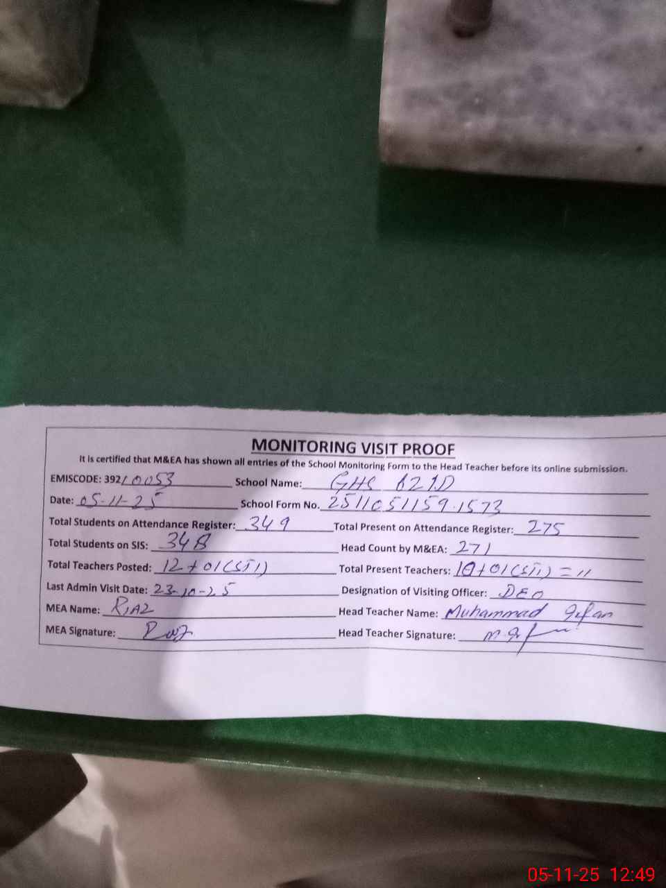 | Attendance Register | Head Teacher | MEA with School | Visit Proof |