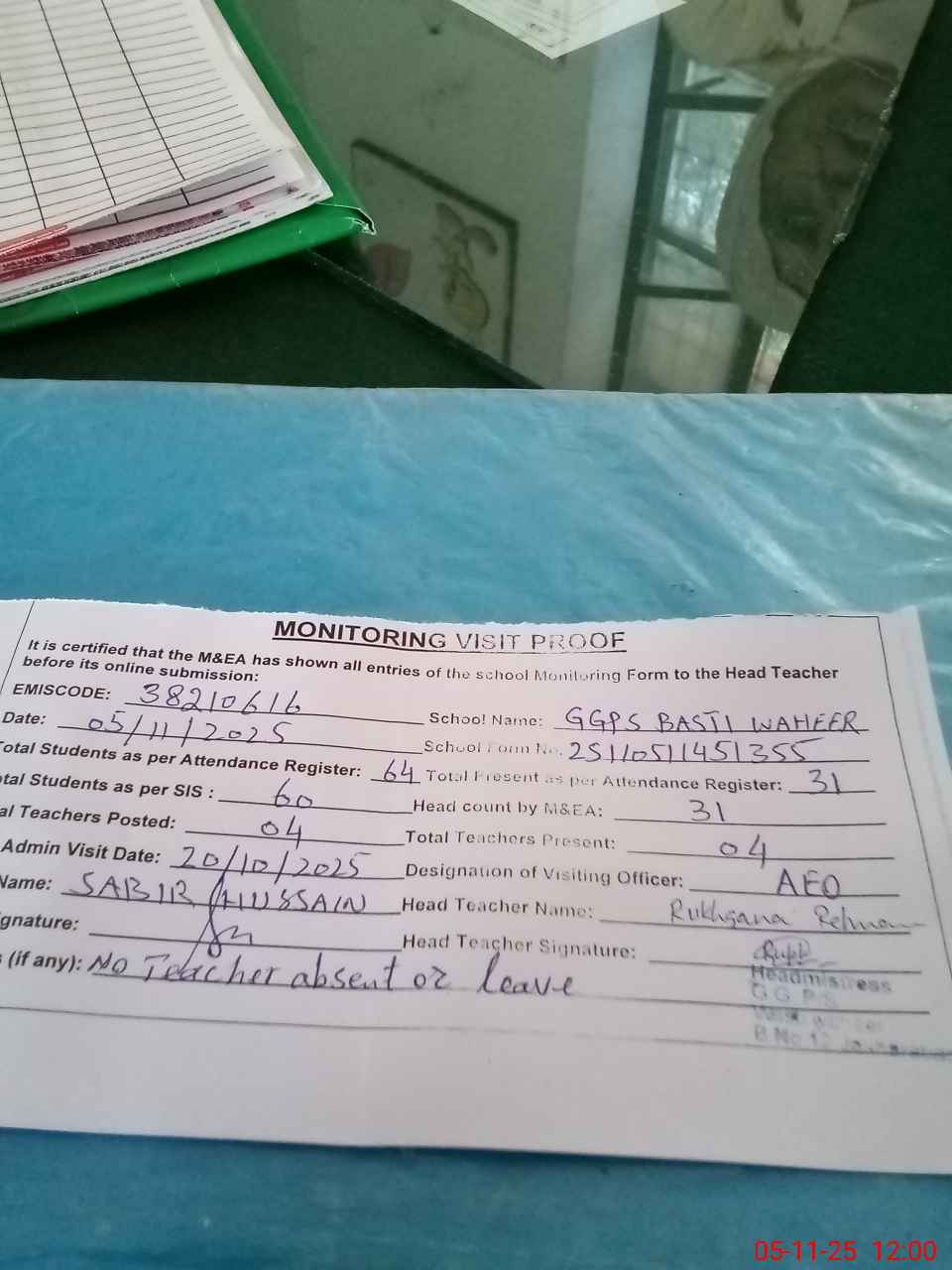 | Remarks (Use Separate Page if Required): No teacher absent or on leave Last admin visit by AEO on 20 Oct 2025 | |||||