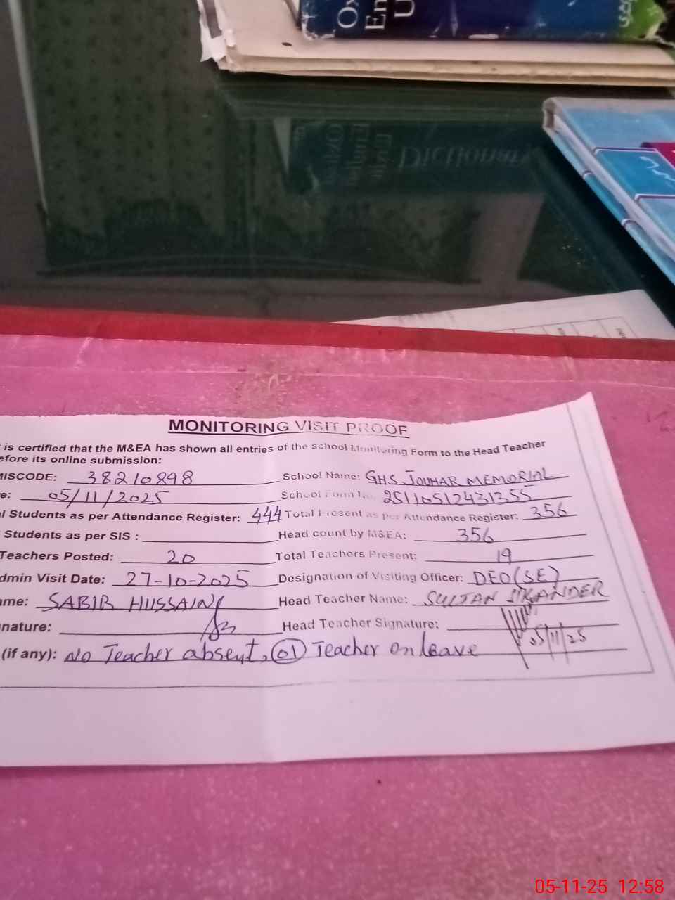 | EMIS Code: 38210898 | Name of School: GHS JOUHAR MEMORIAL JUHARABAD | |||