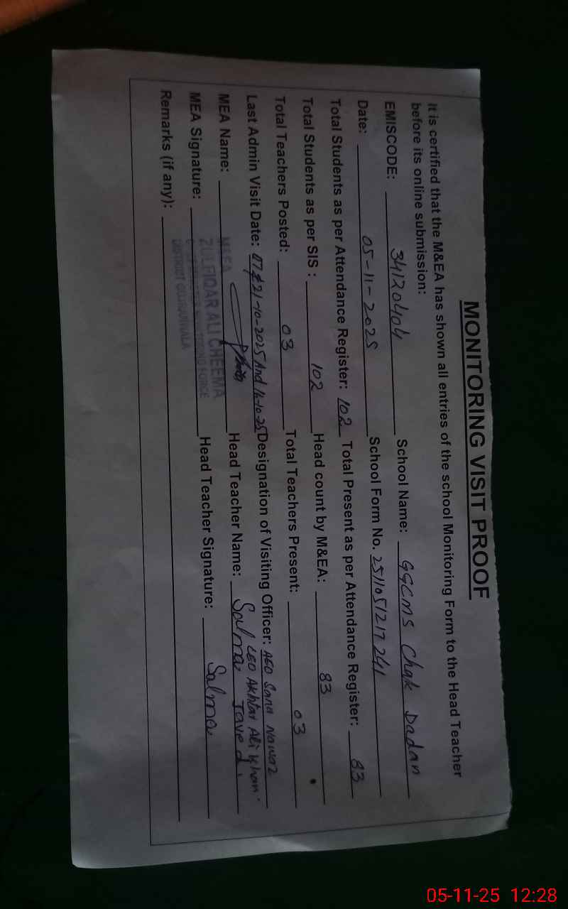 | EMIS Code: 34120404 | Name of School: GGCMS CHAK DADAN | |||
