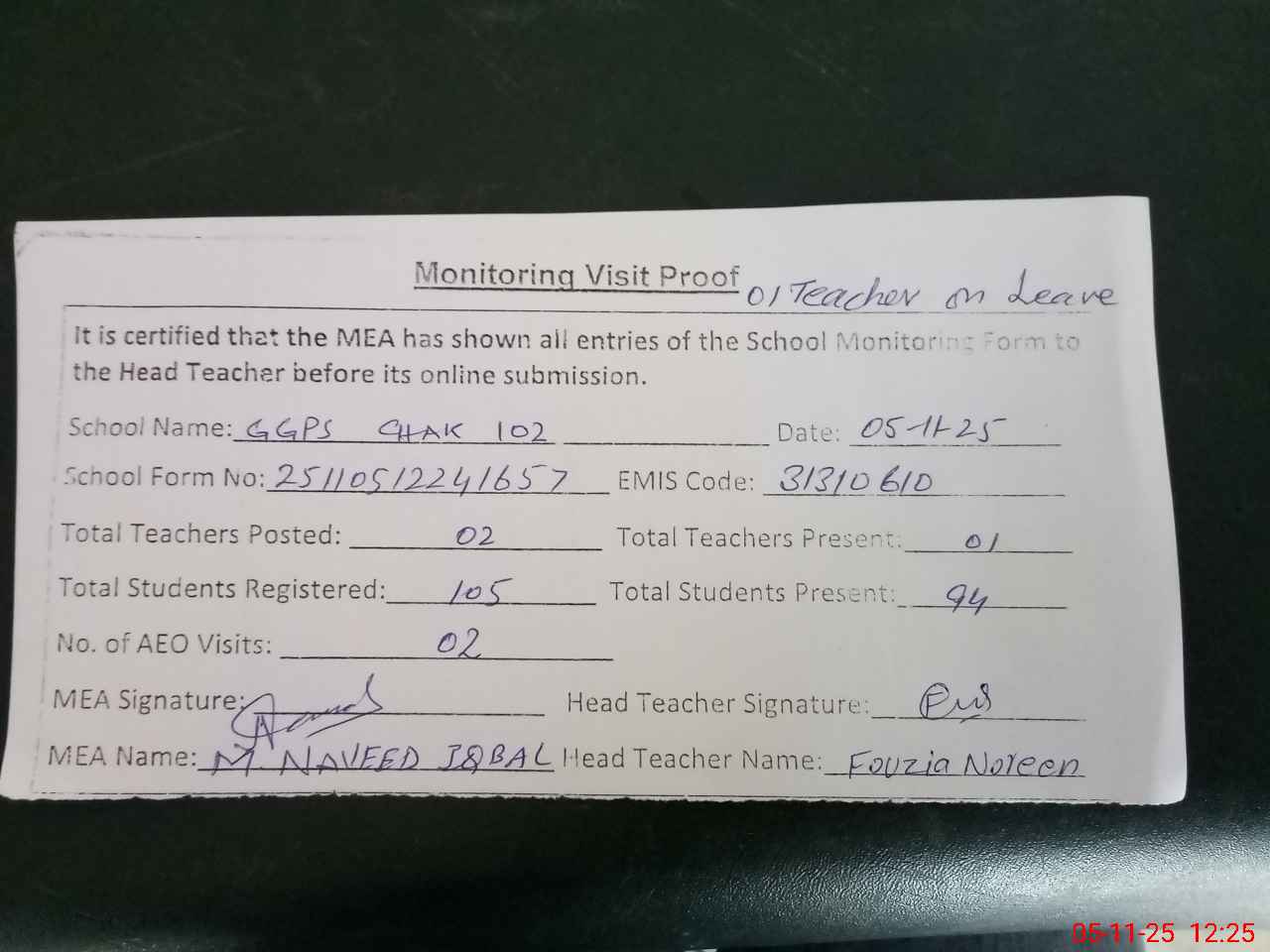 | Attendance Register | Head Teacher | MEA with School | Visit Proof |