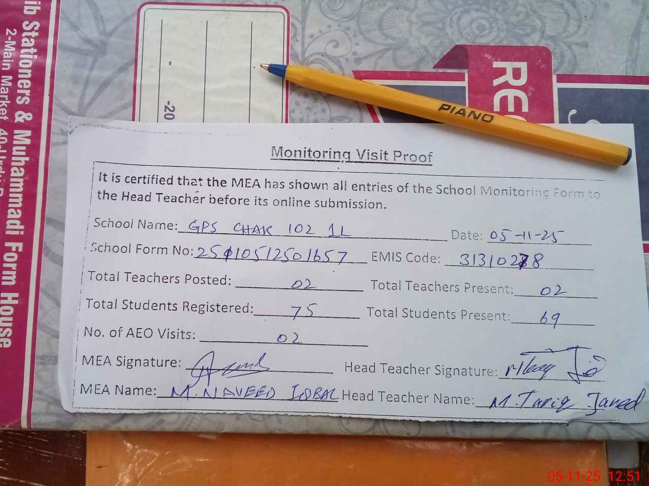 | EMIS Code: 31310278 | Name of School: GPS CHAK 102 1/L (After Noon) | |||