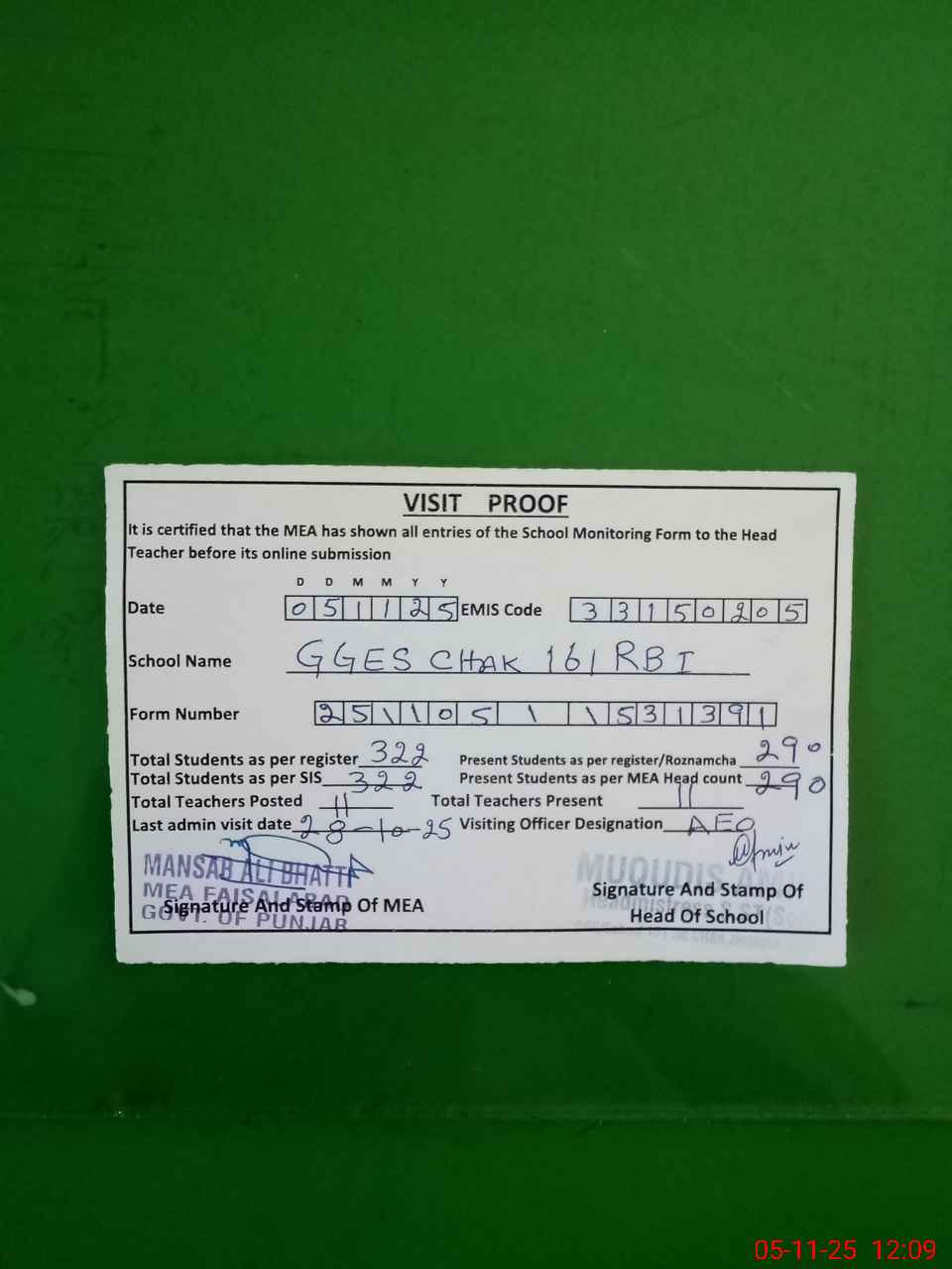 | Certified that this School was Inspected by the Undersigned MEA/DMO Today and the Information Stated Above is as Per Record. | |||||