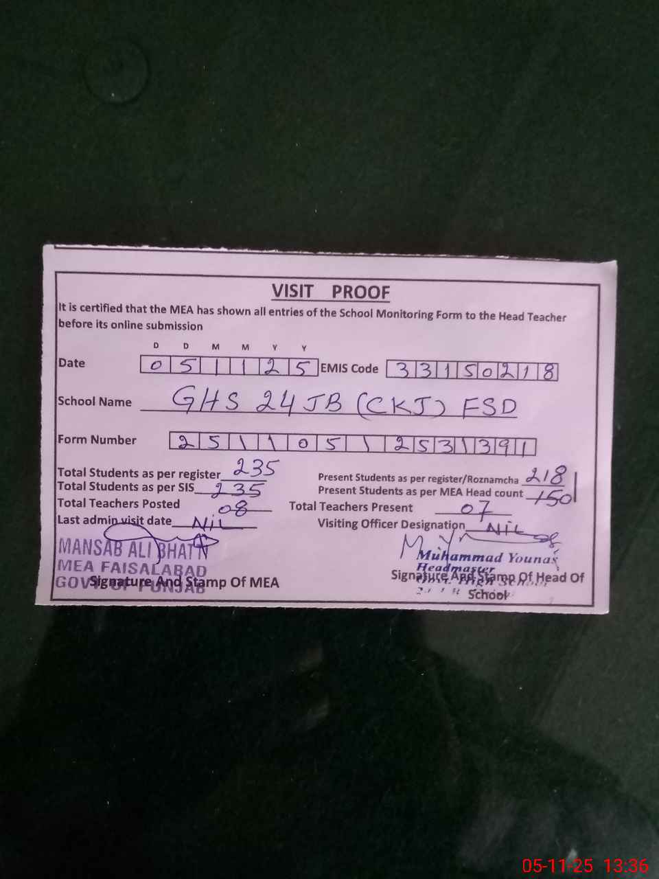 | EMIS Code: 33150218 | Name of School: GHS CHAK 24 JB CHAK JHUMRA FSD | |||