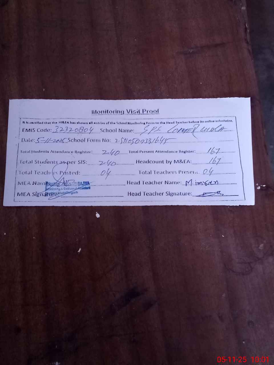 | Attendance Register | Head Teacher | MEA with School | Visit Proof |