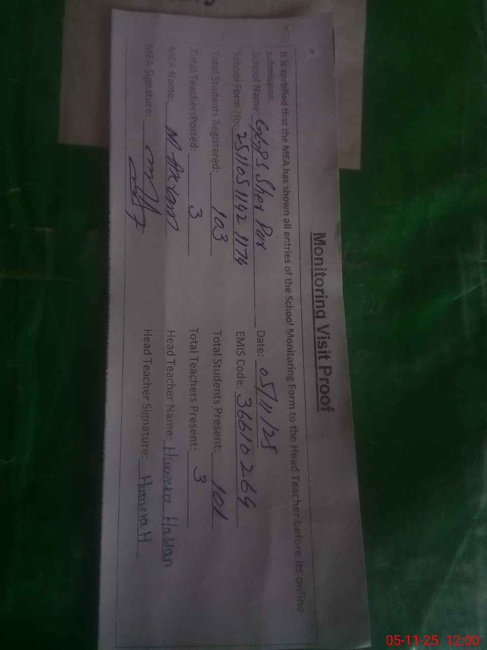 | Attendance Register | Head Teacher | MEA with School | Visit Proof |