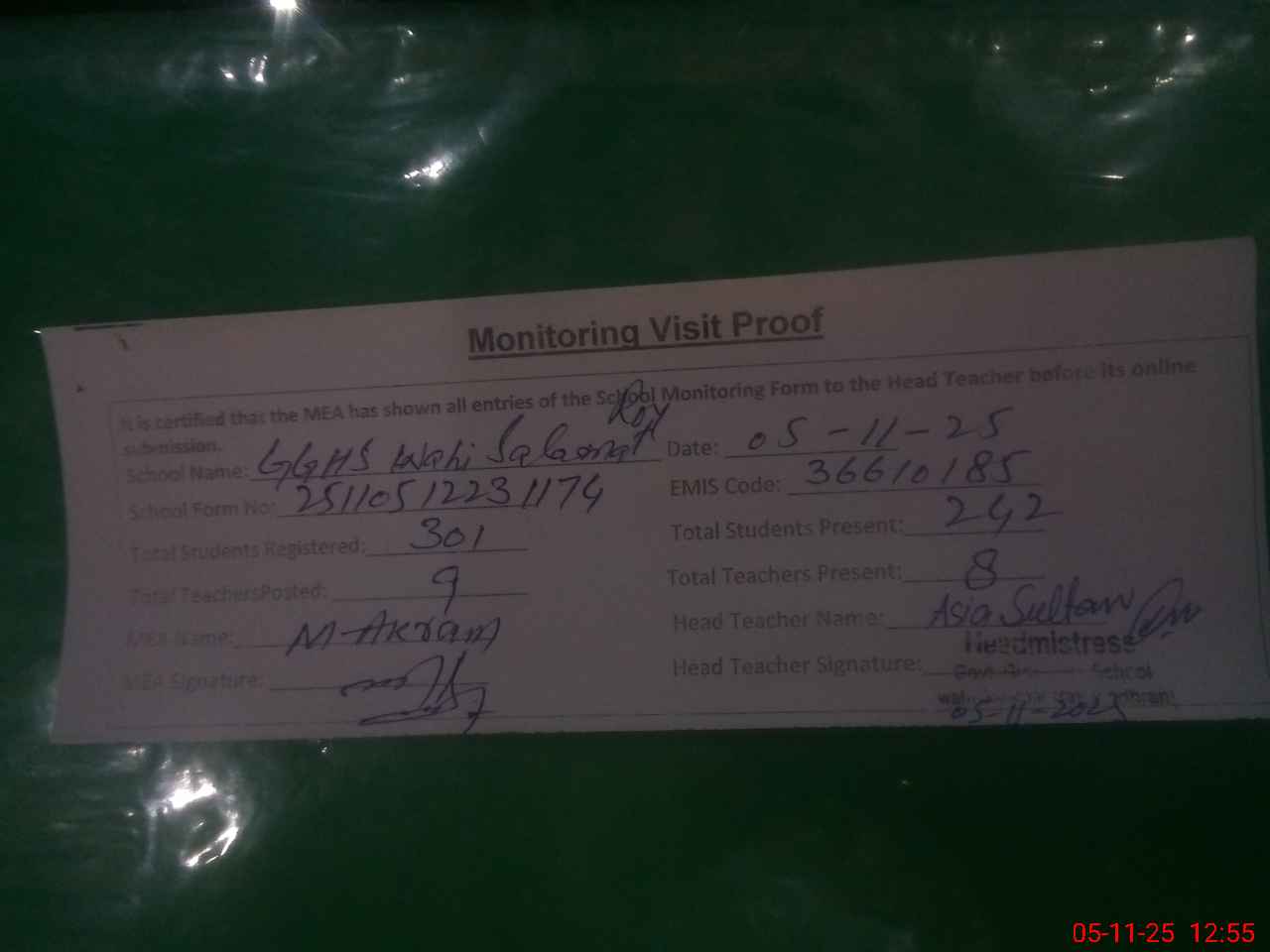 | Attendance Register | Head Teacher | MEA with School | Visit Proof |
