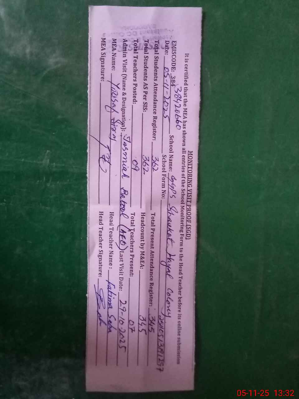 | EMIS Code: 38420660 | Name of School: GGPS SHAUKAT HAYAT COLONY SARGODHA | |||