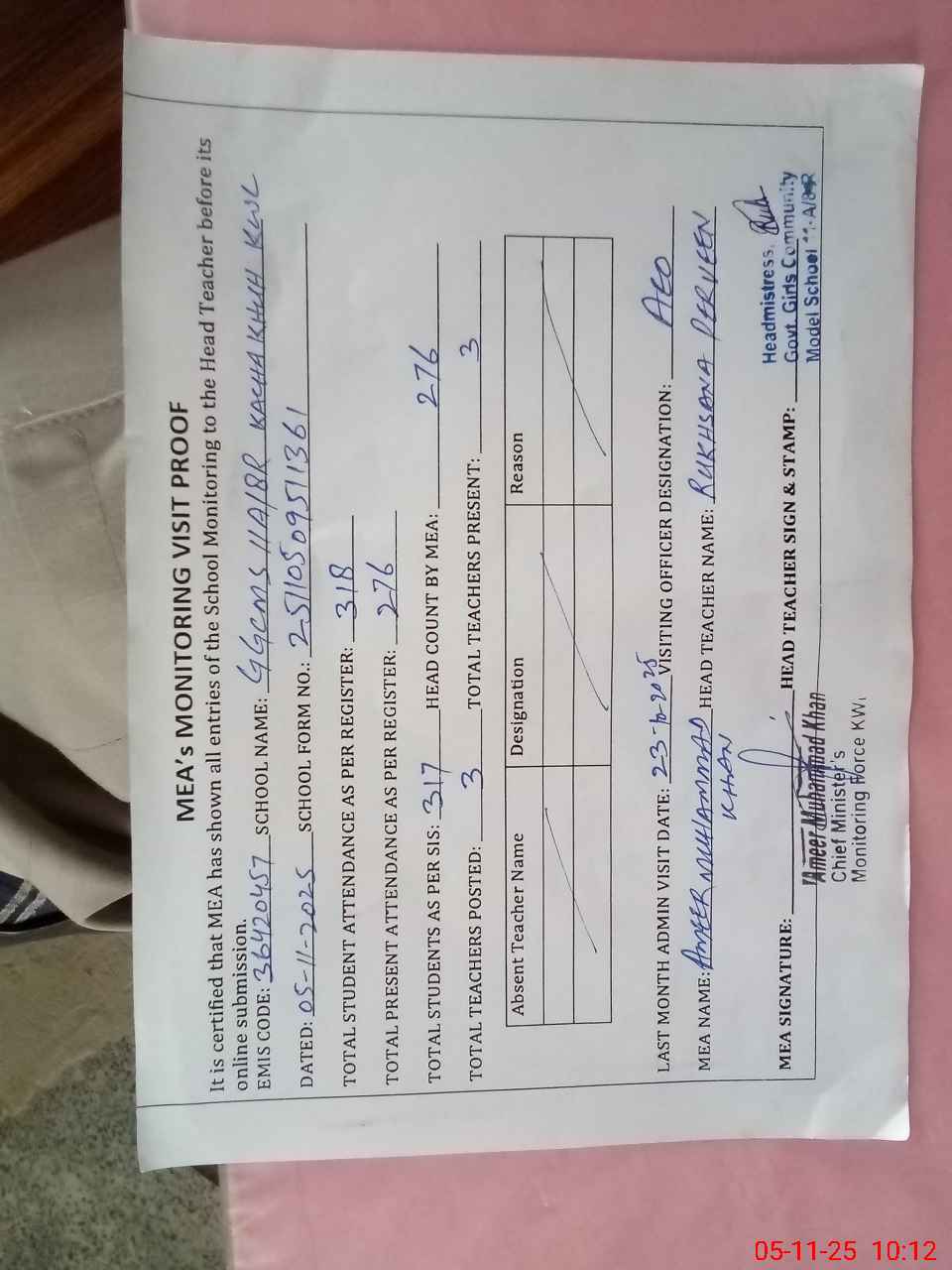 | Attendance Register | Head Teacher | MEA with School | Visit Proof |