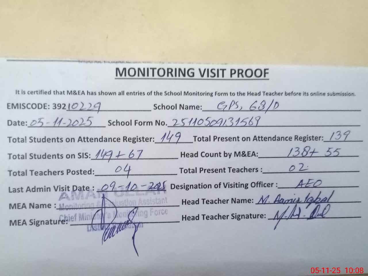 | Attendance Register | Head Teacher | MEA with School | Visit Proof |