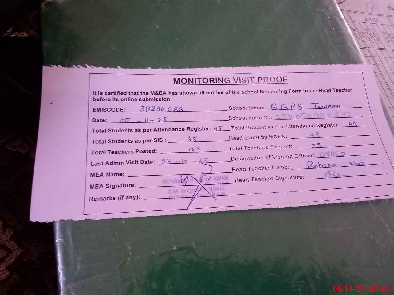 | Remarks (Use Separate Page if Required): Students on SIS Qty 45 Last admin visit On 23 October 2025 | |||||