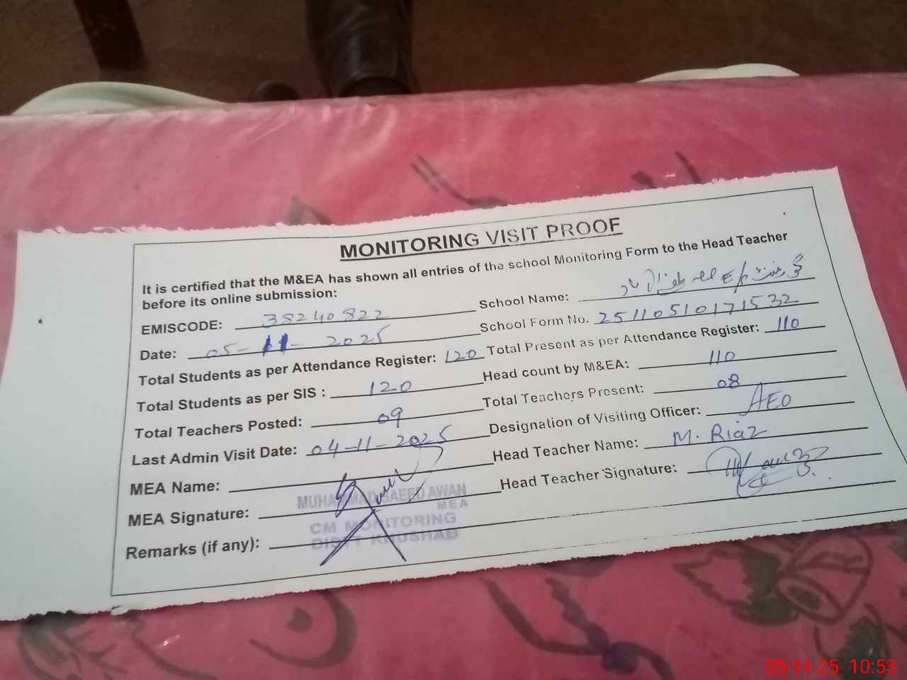 | Remarks (Use Separate Page if Required): Students on SIS Qty 120 Last admin visit On 04 October 2025 by AEO | |||||