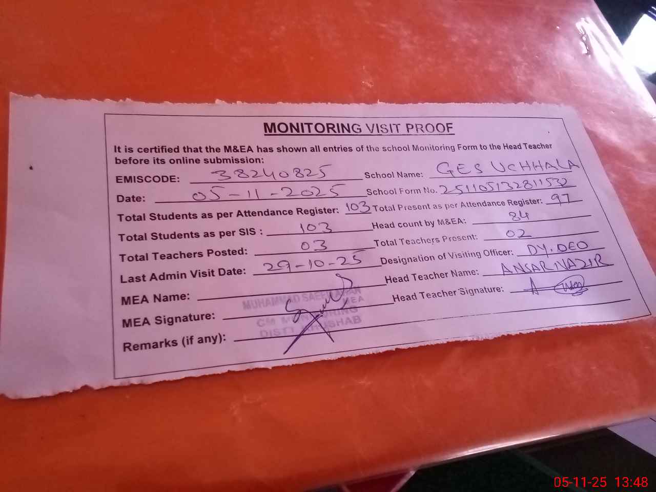 | Remarks (Use Separate Page if Required): Students on SIS QTY 103 Last admin visit On 29 October 2025 by DY DEO | |||||