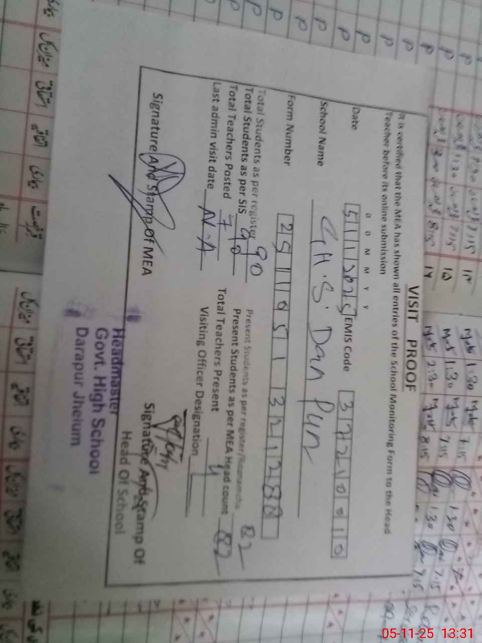 | Attendance Register | Head Teacher | MEA with School | Visit Proof |