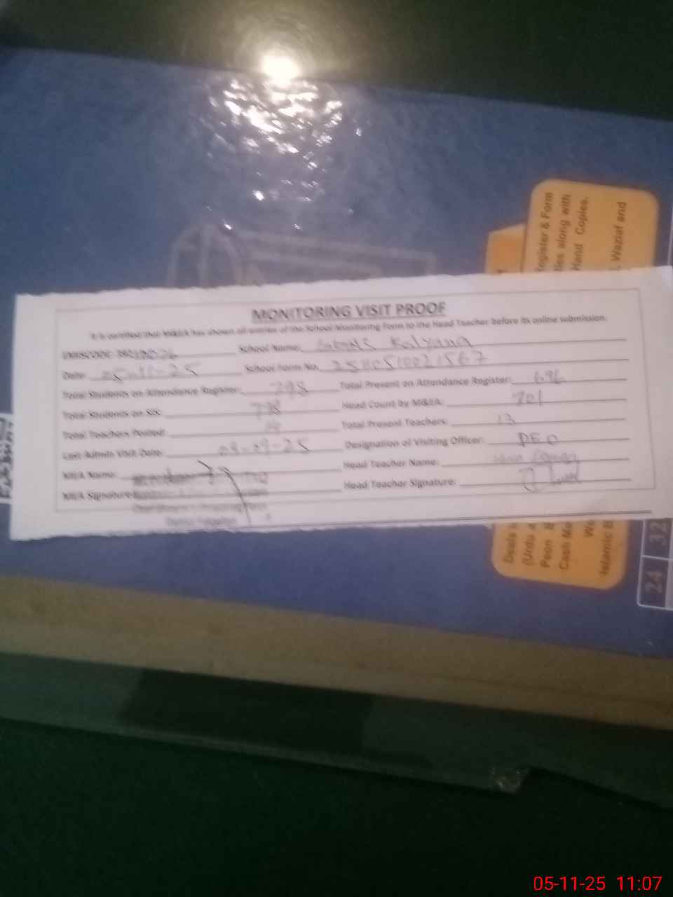 | Attendance Register | Head Teacher | MEA with School | Visit Proof |