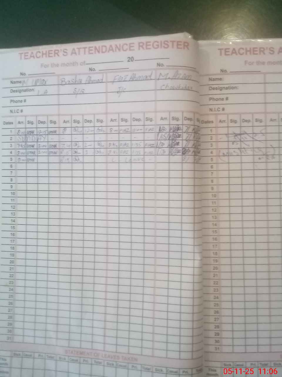 | CNIC | Full Name | Designation | R/C | Absence During Last Calender Month |