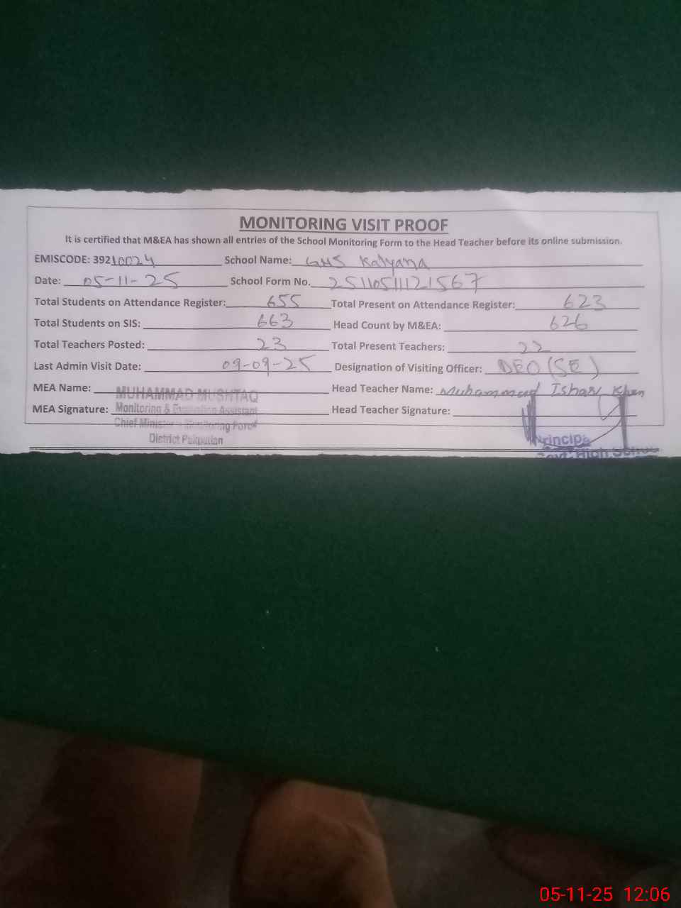 | Attendance Register | Head Teacher | MEA with School | Visit Proof |