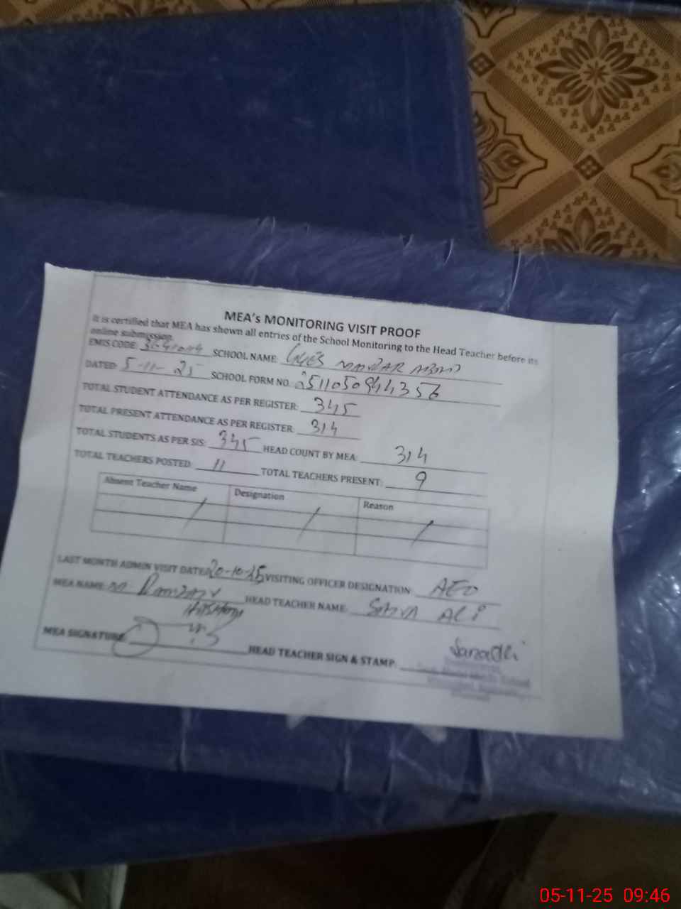 | Attendance Register | Head Teacher | MEA with School | Visit Proof |