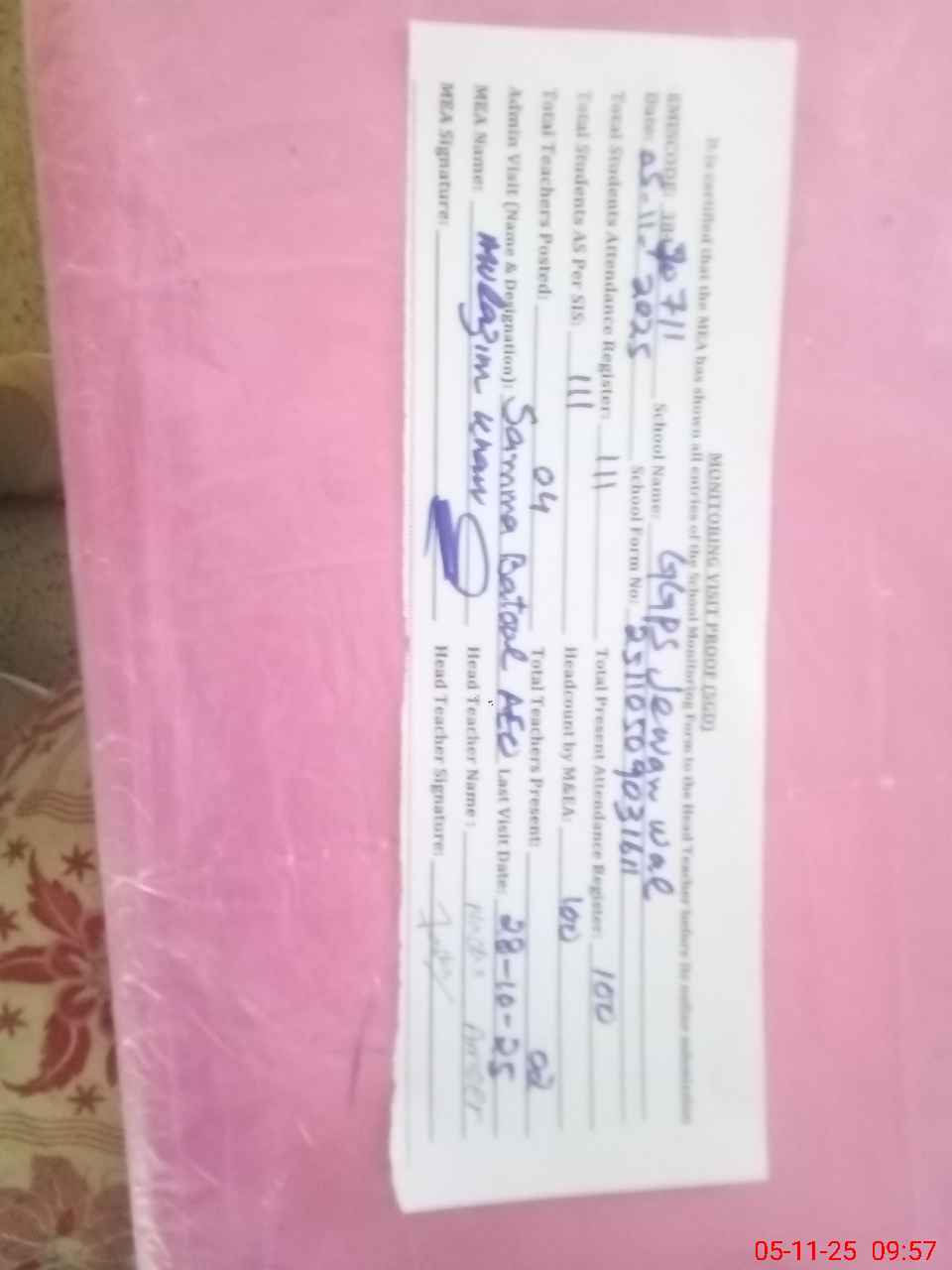 | Attendance Register | Head Teacher | MEA with School | Visit Proof |