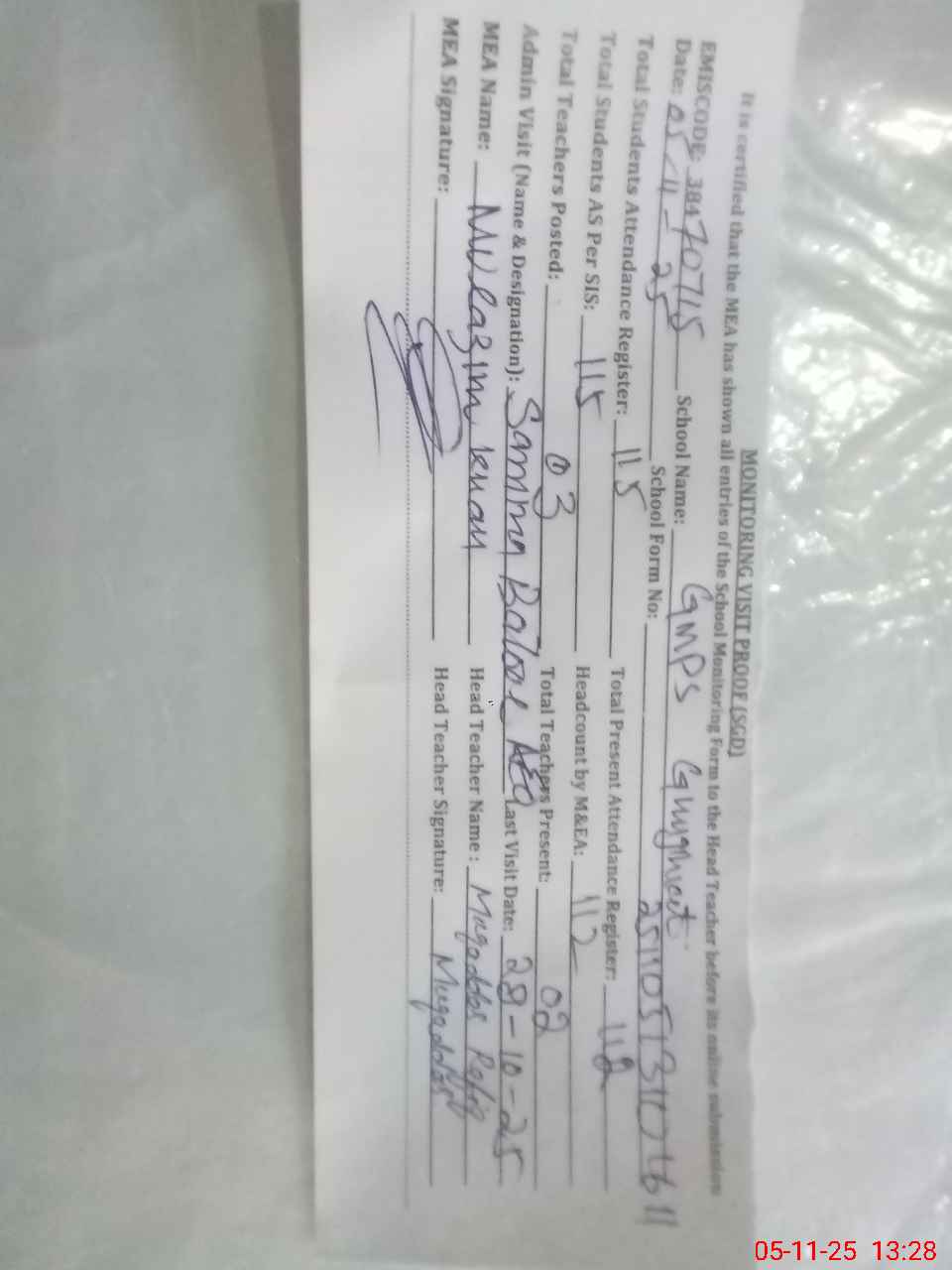 | Attendance Register | Head Teacher | MEA with School | Visit Proof |
