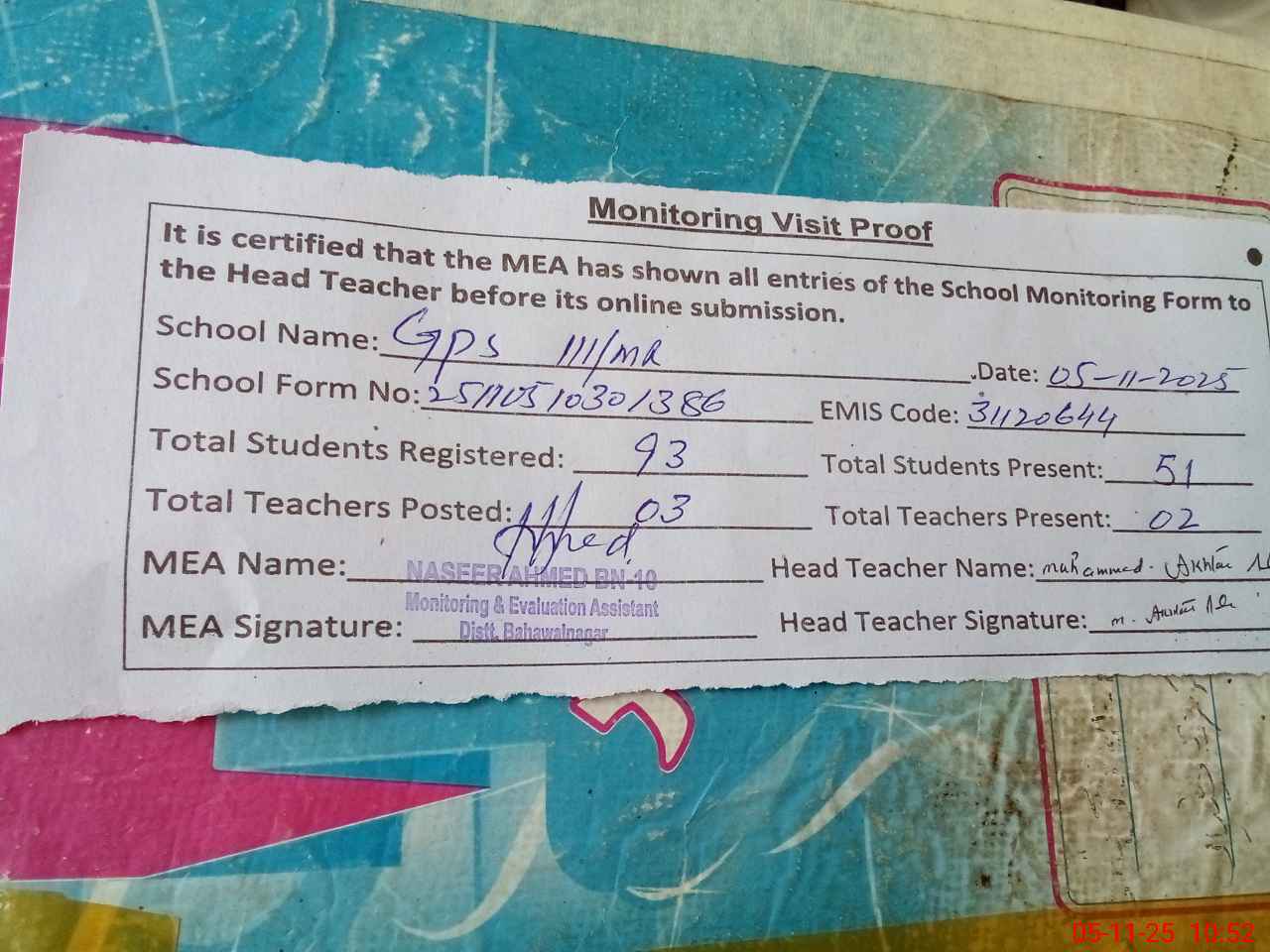 | EMIS Code: 31120644 | Name of School: GPS CHAK 111/M | |||