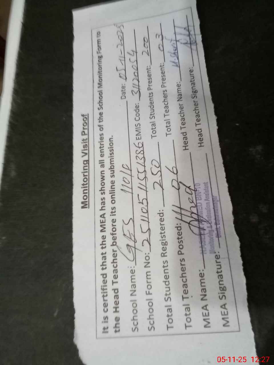 | Attendance Register | Head Teacher | MEA with School | Visit Proof |