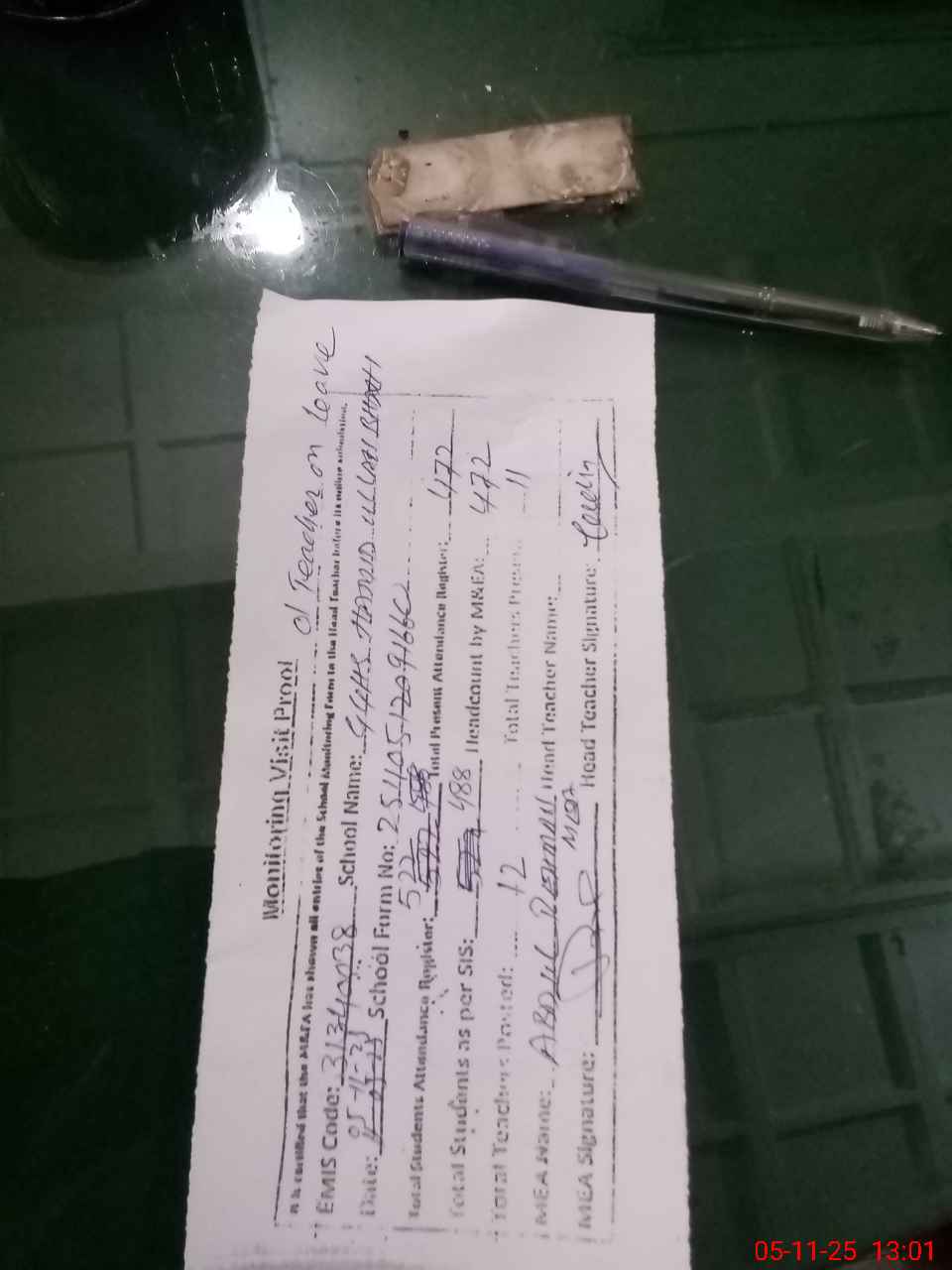 | Attendance Register | Head Teacher | MEA with School | Visit Proof |