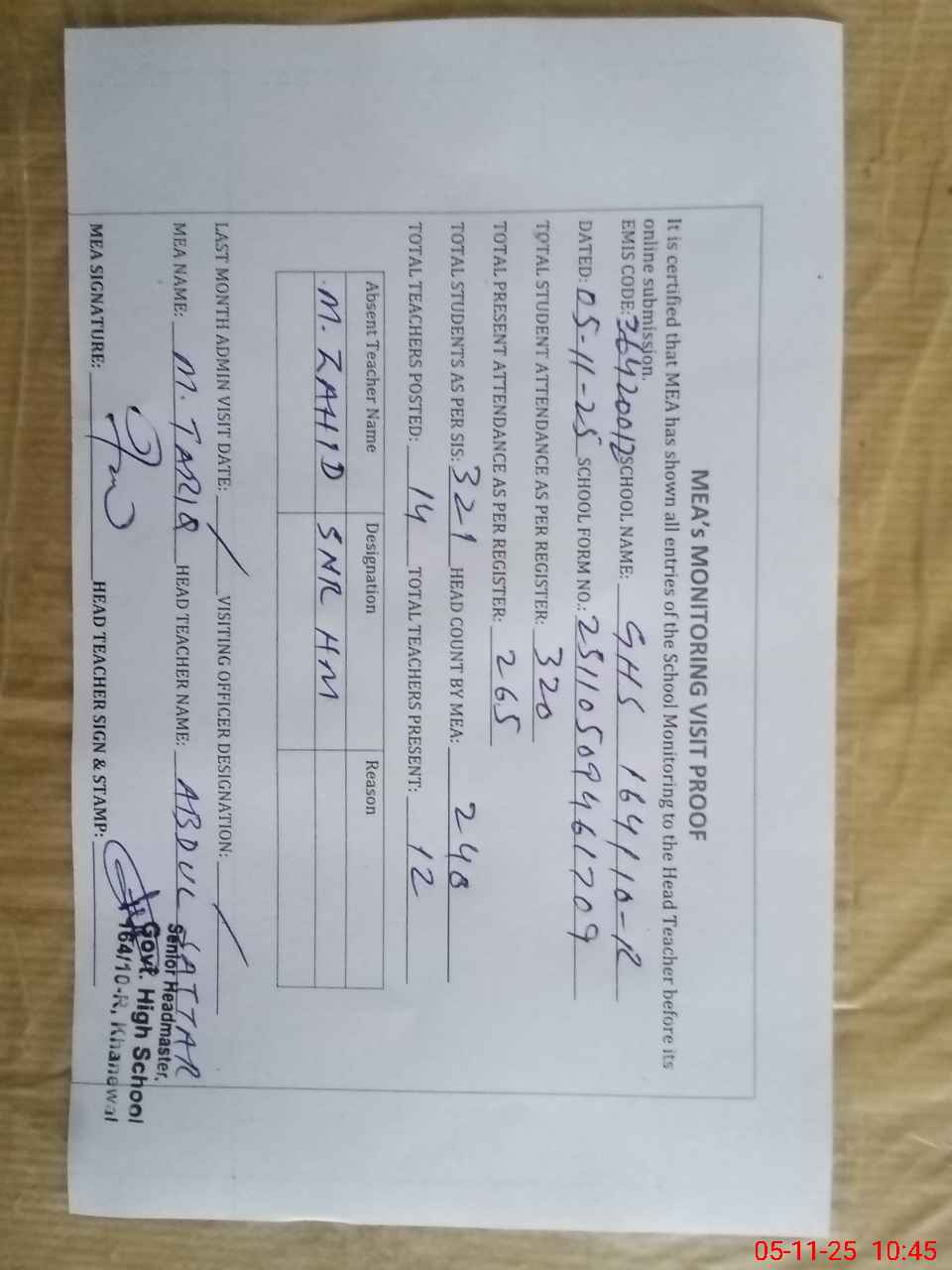 | Attendance Register | Head Teacher | MEA with School | Visit Proof |