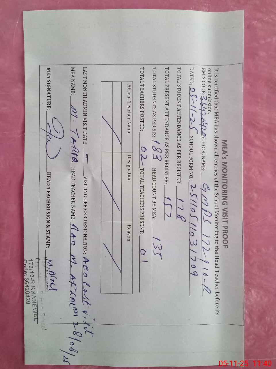 | EMIS Code: 36420420 | Name of School: GMPS 172/10-R, KHANEWAL | |||