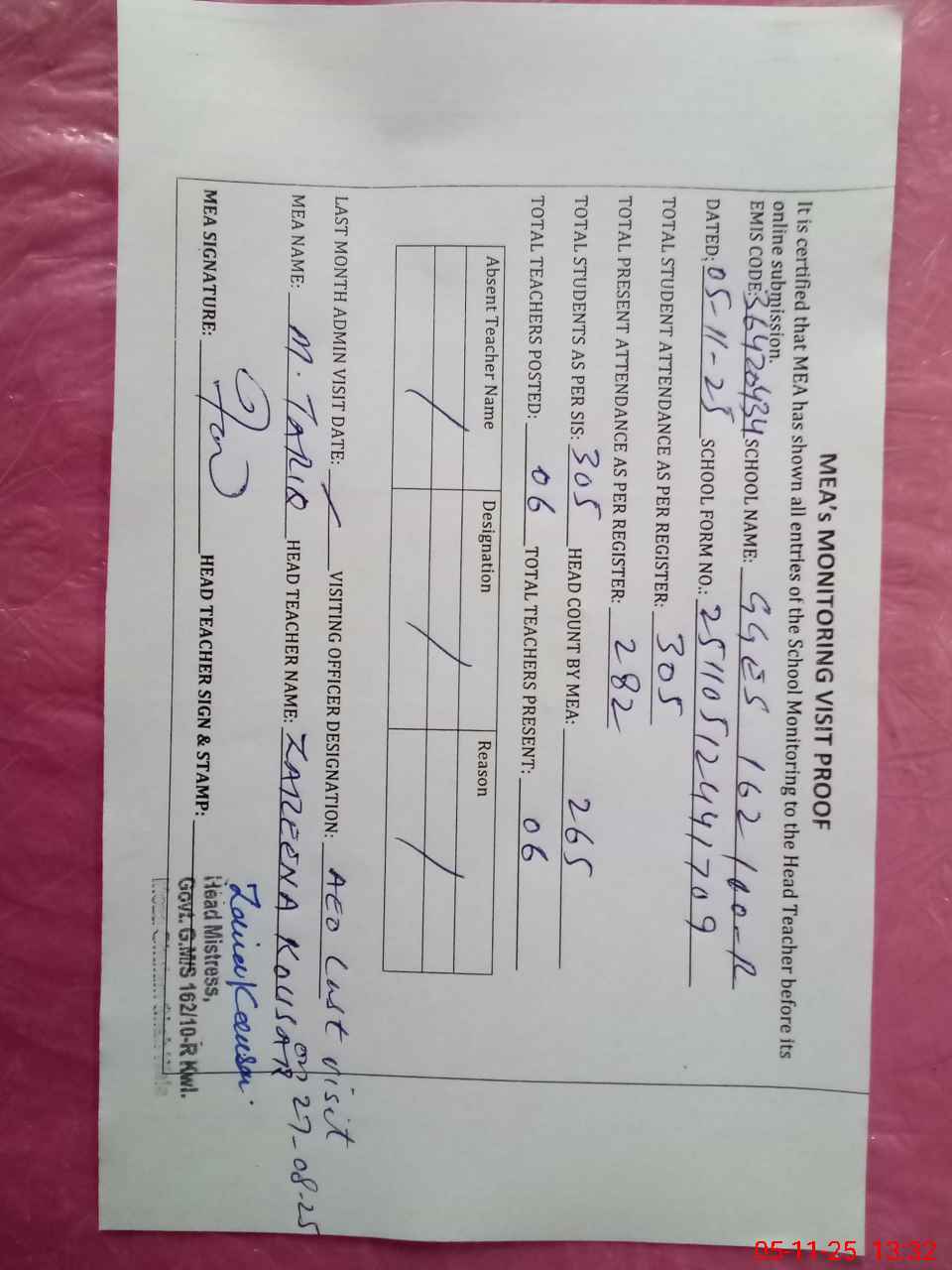 | Attendance Register | Head Teacher | MEA with School | Visit Proof |