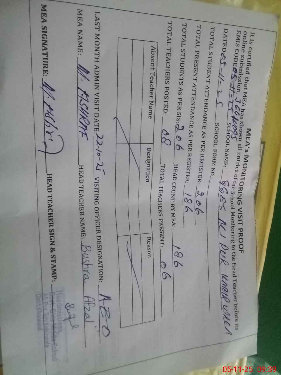 | Attendance Register | Head Teacher | MEA with School | Visit Proof |