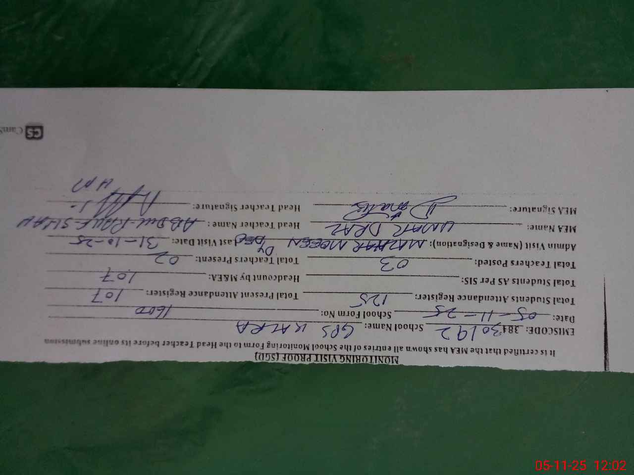 | Attendance Register | Head Teacher | MEA with School | Visit Proof |