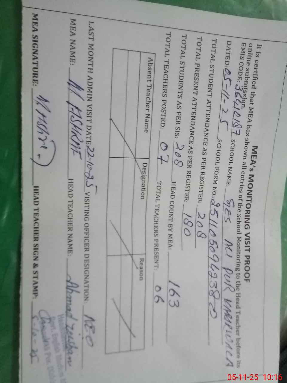 | Attendance Register | Head Teacher | MEA with School | Visit Proof |