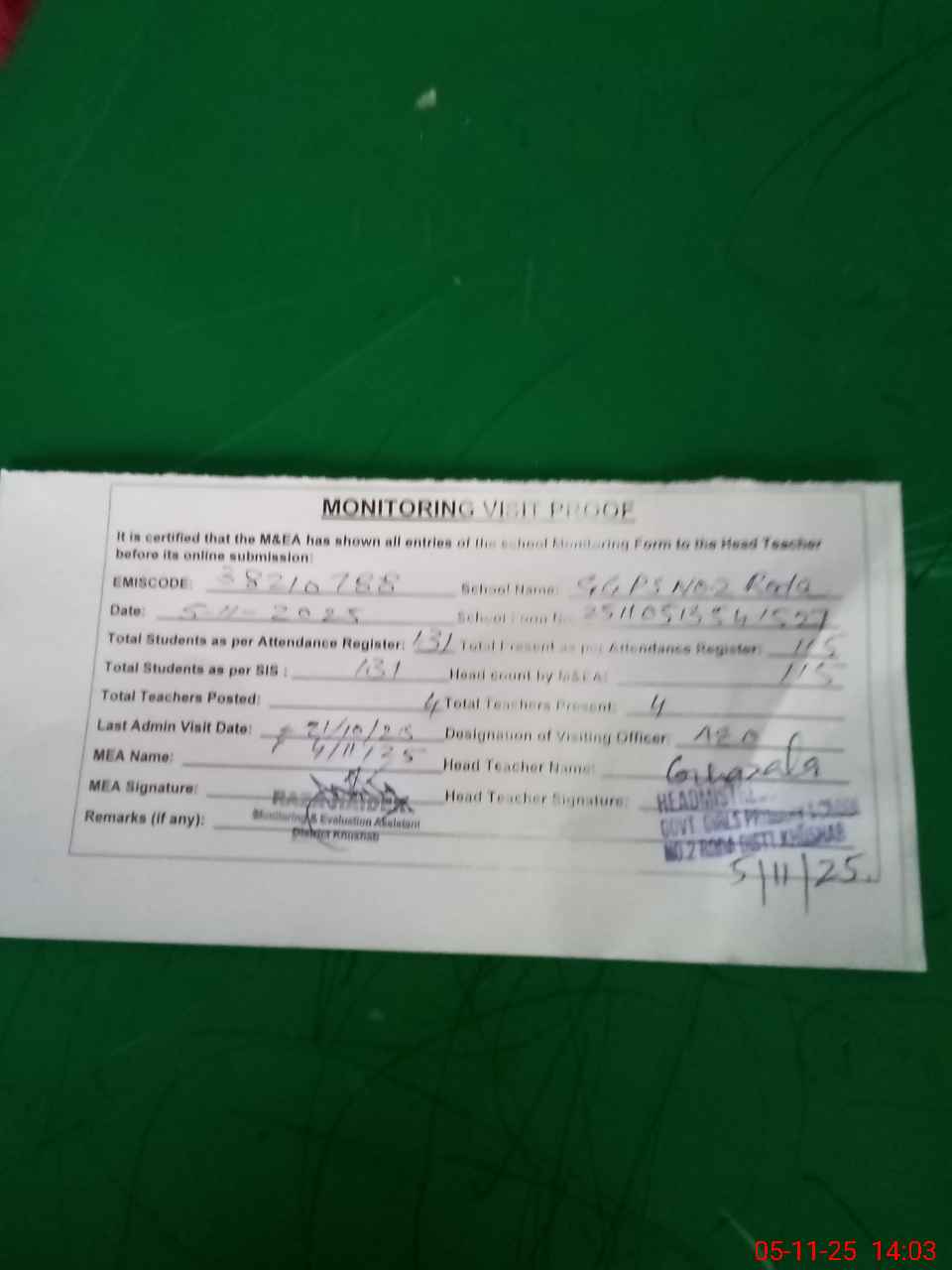 | Attendance Register | Head Teacher | MEA with School | Visit Proof |