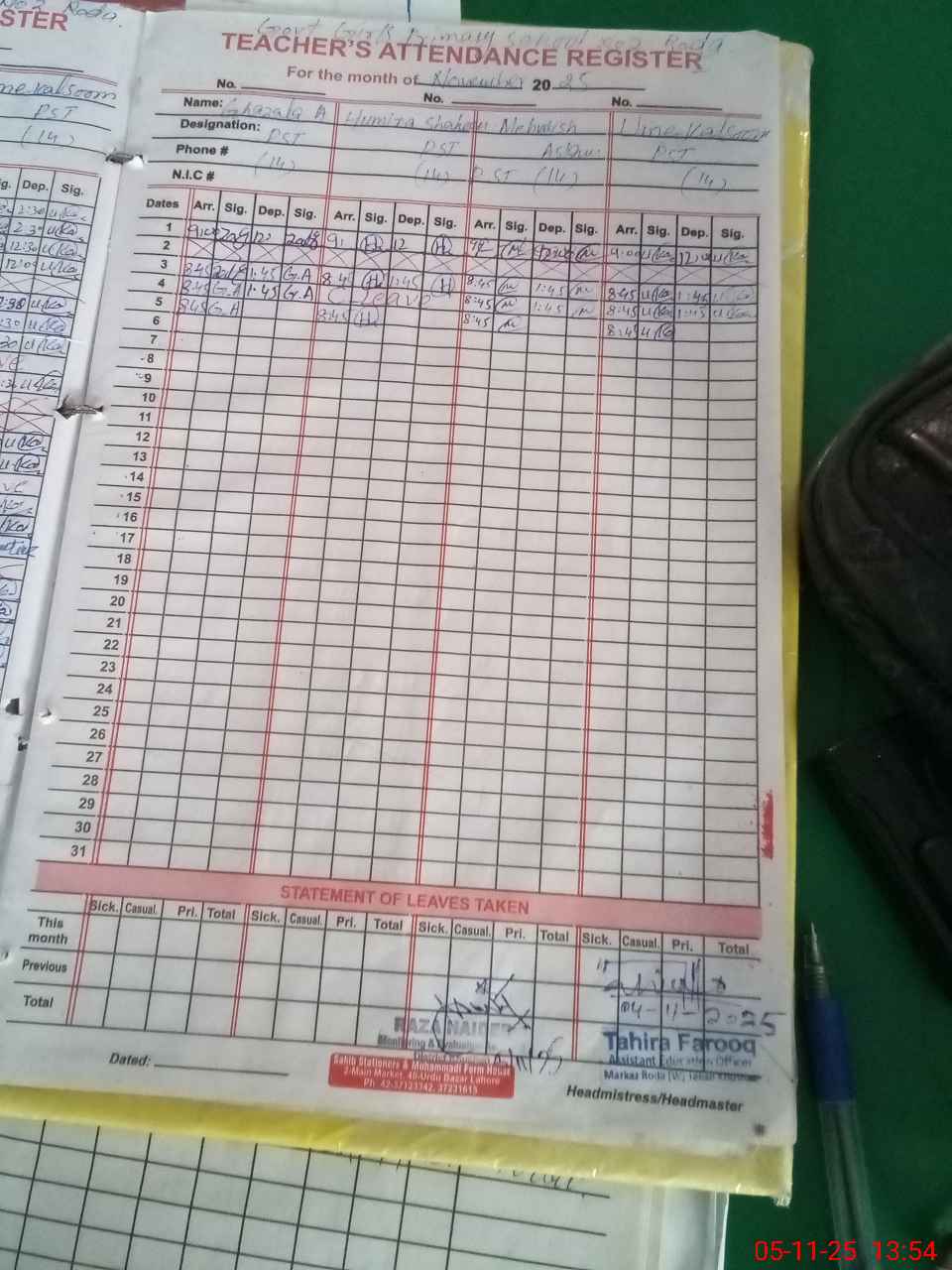 | CNIC | Full Name | Designation | R/C | Absence During Last Calender Month |