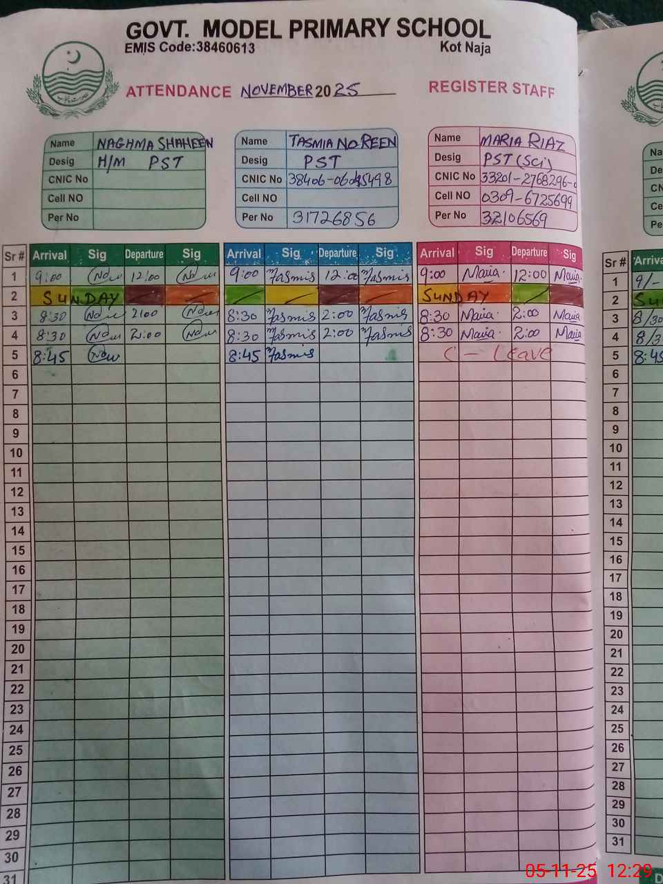 | CNIC | Full Name | Designation | R/C | Absence During Last Calender Month |