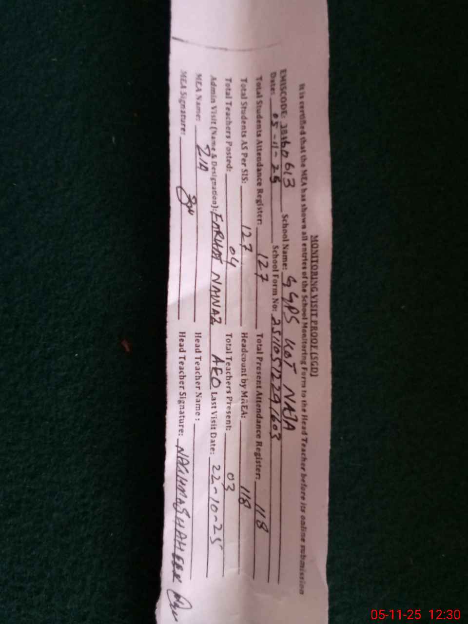 | Attendance Register | Head Teacher | MEA with School | Visit Proof |