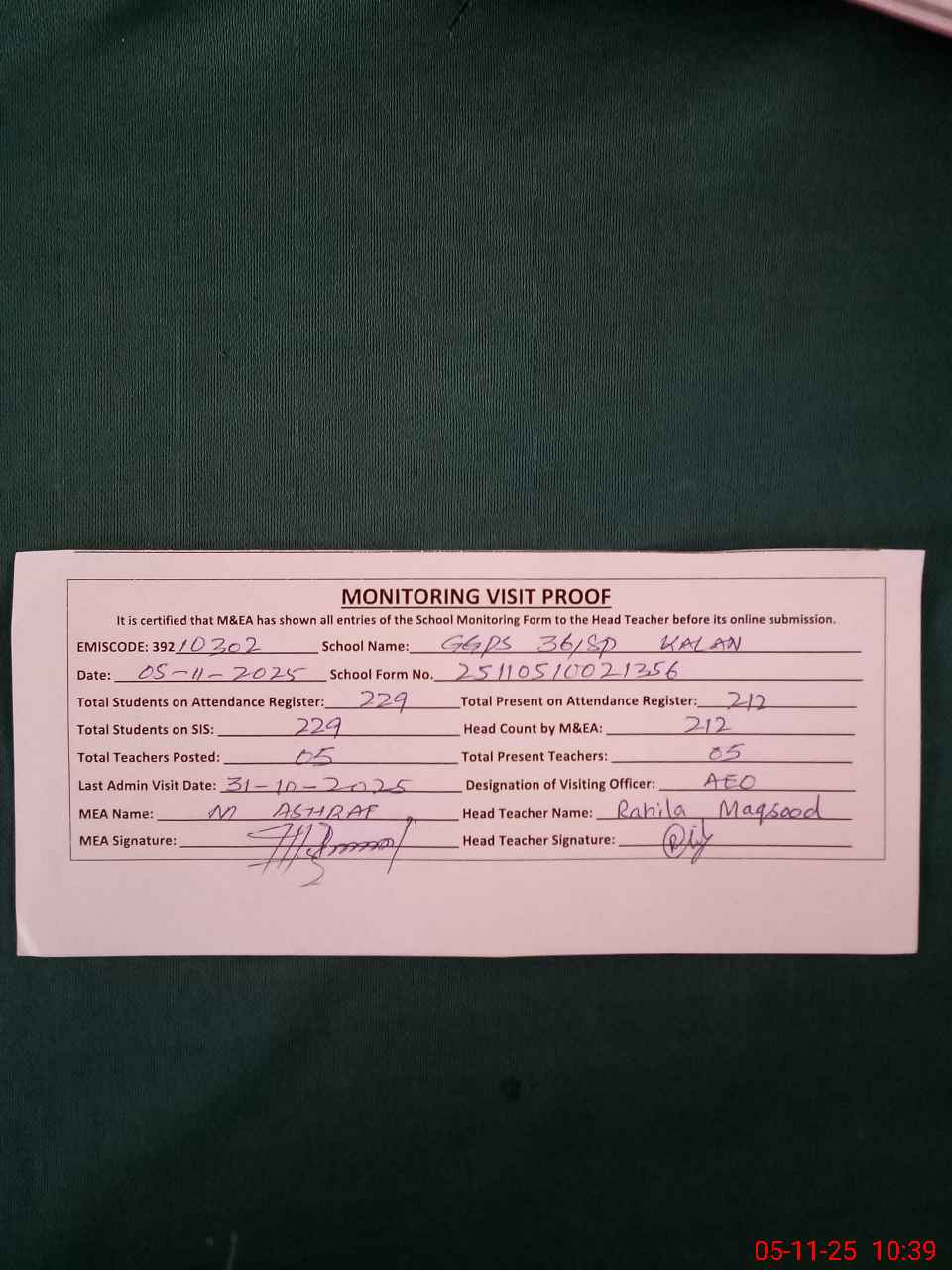 | Attendance Register | Head Teacher | MEA with School | Visit Proof |