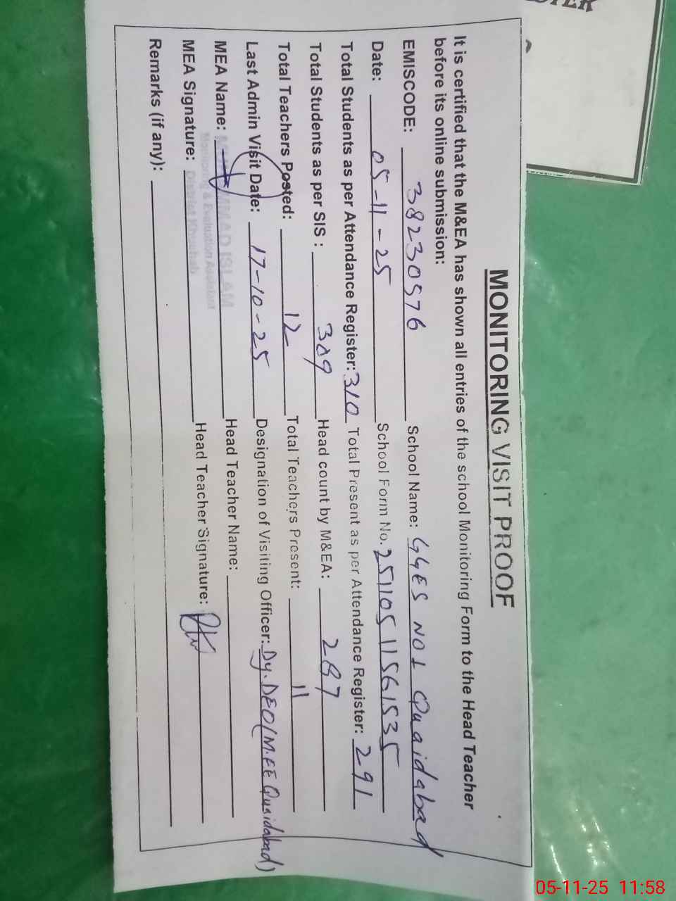 | Remarks (Use Separate Page if Required): Dy DEO visited school on 17 October 2025 Students strength on sis 309 | |||||