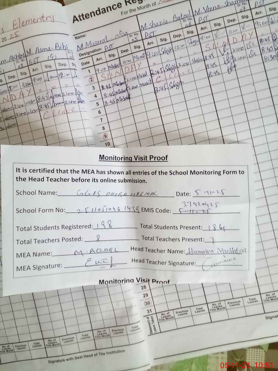 | Attendance Register | Head Teacher | MEA with School | Visit Proof |