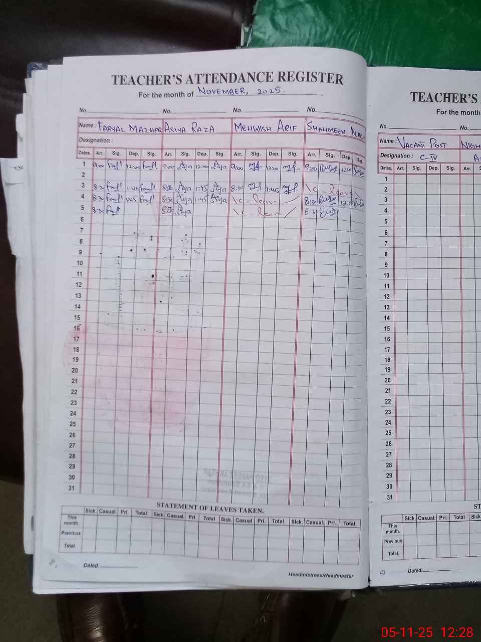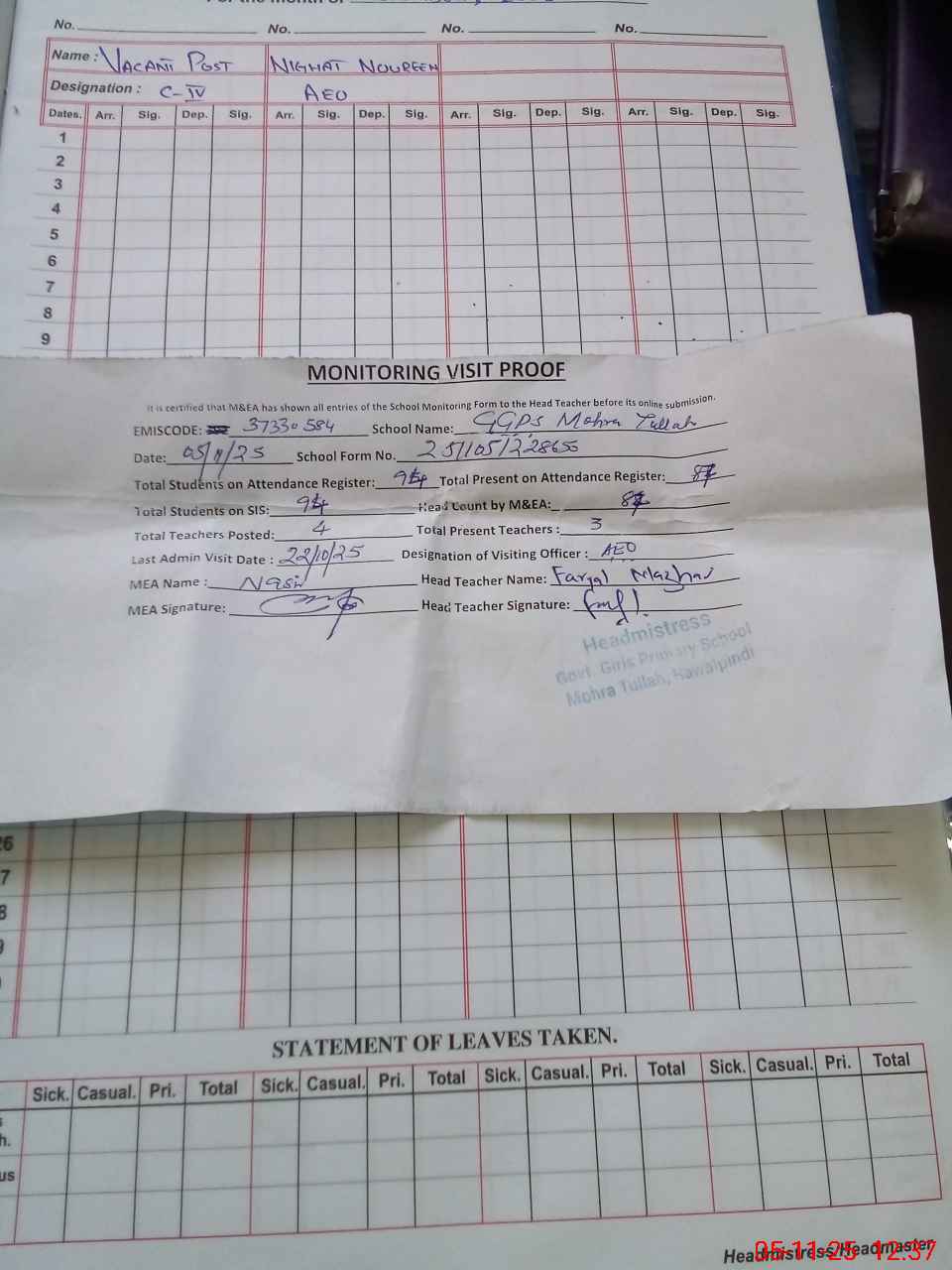 | Attendance Register | Head Teacher | MEA with School | Visit Proof |