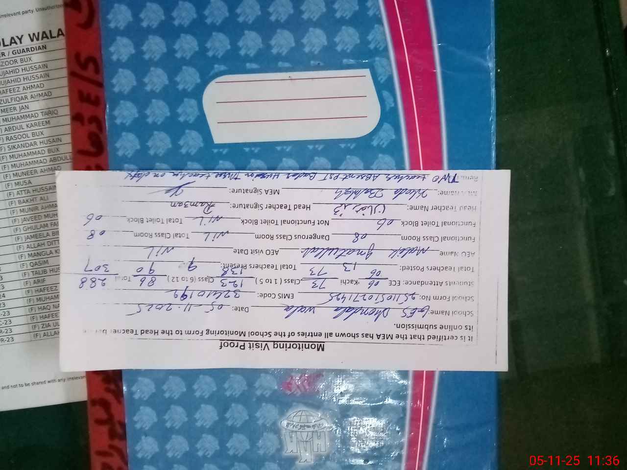 | Attendance Register | Head Teacher | MEA with School | Visit Proof |