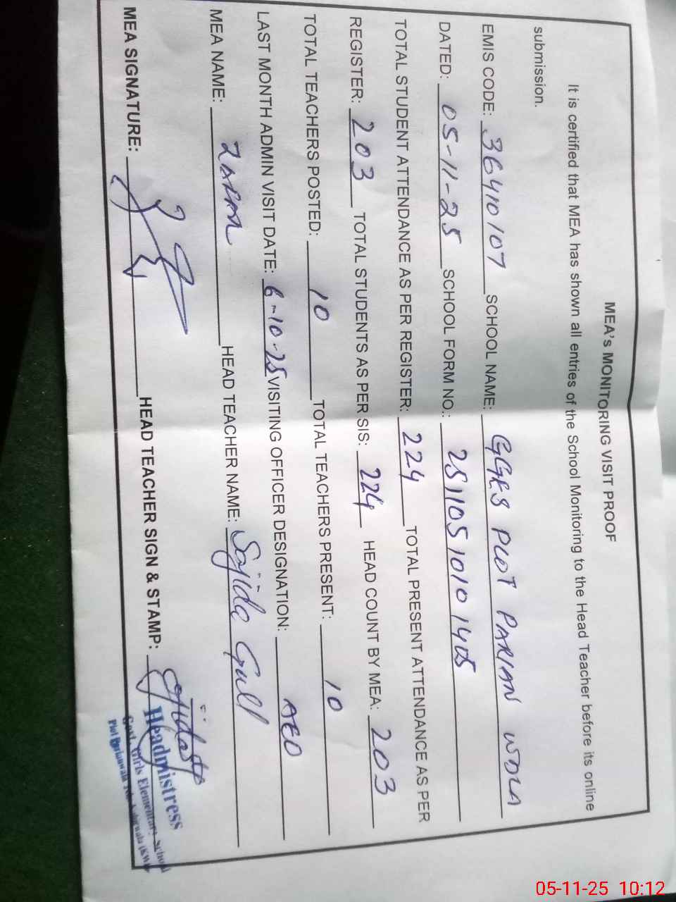 | Attendance Register | Head Teacher | MEA with School | Visit Proof |