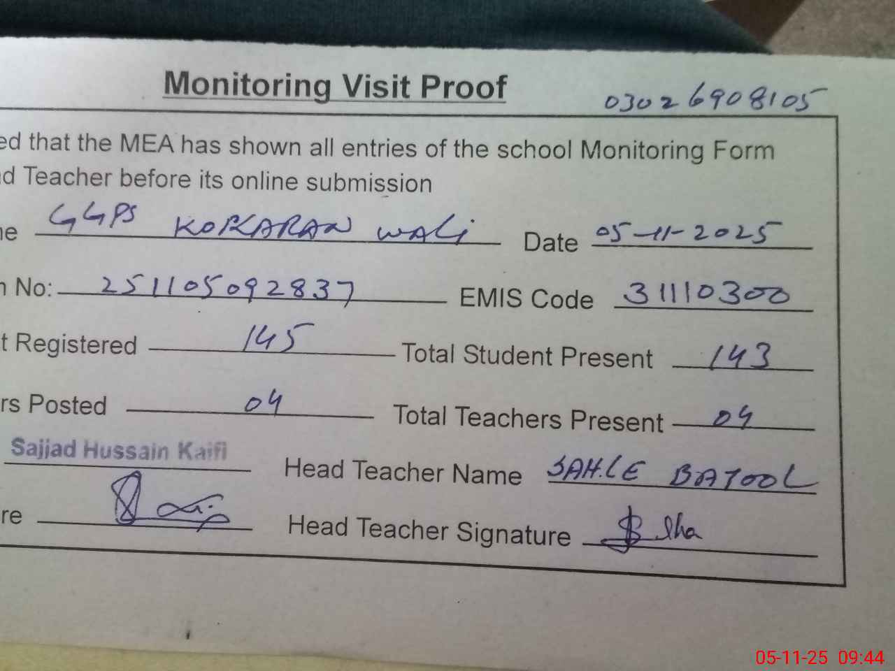 | EMIS Code: 31110300 | Name of School: GGPS KOKARAN WALI | |||