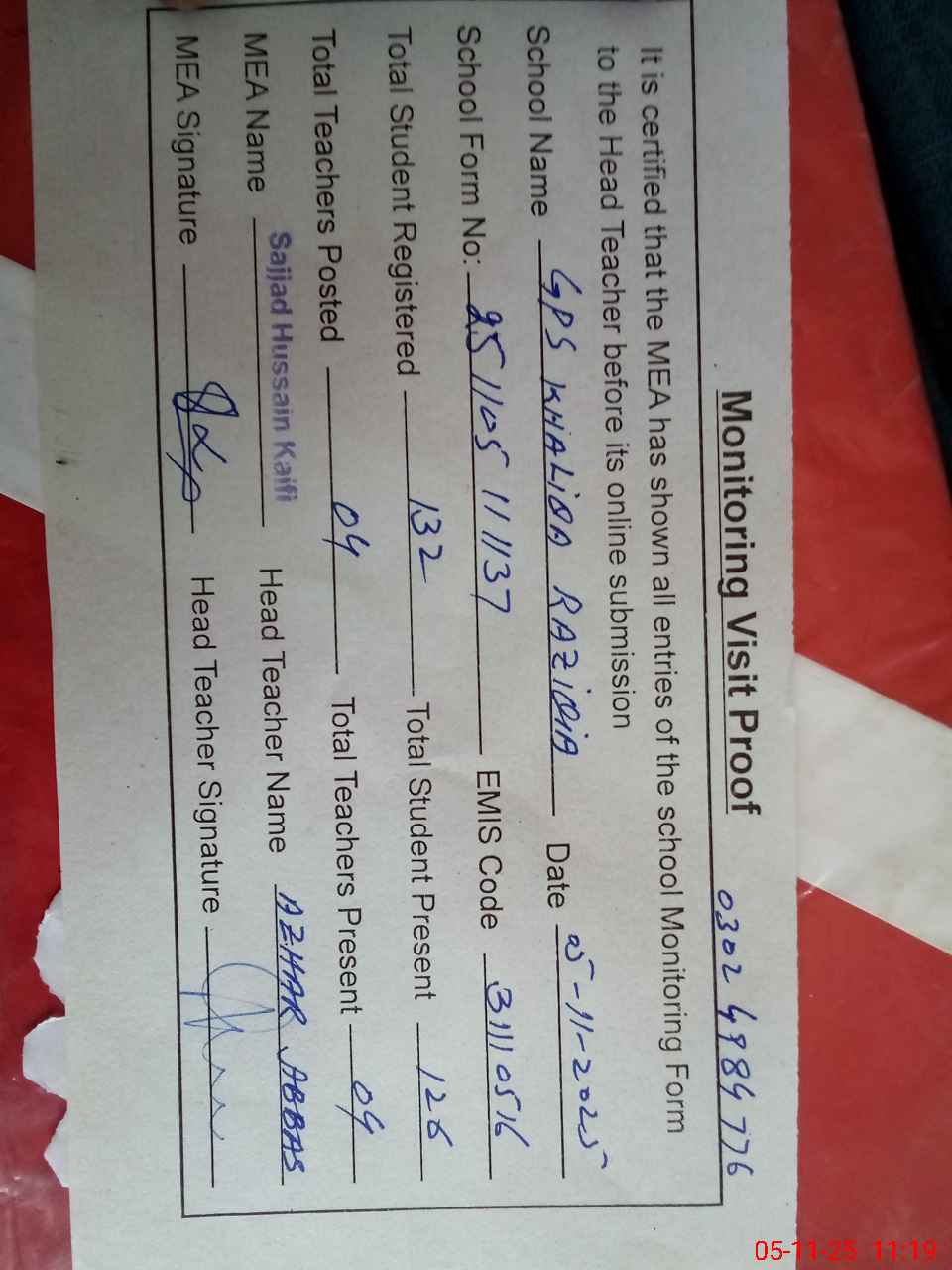 | EMIS Code: 31110516 | Name of School: GPS KHALIQA RAZIQIA | |||