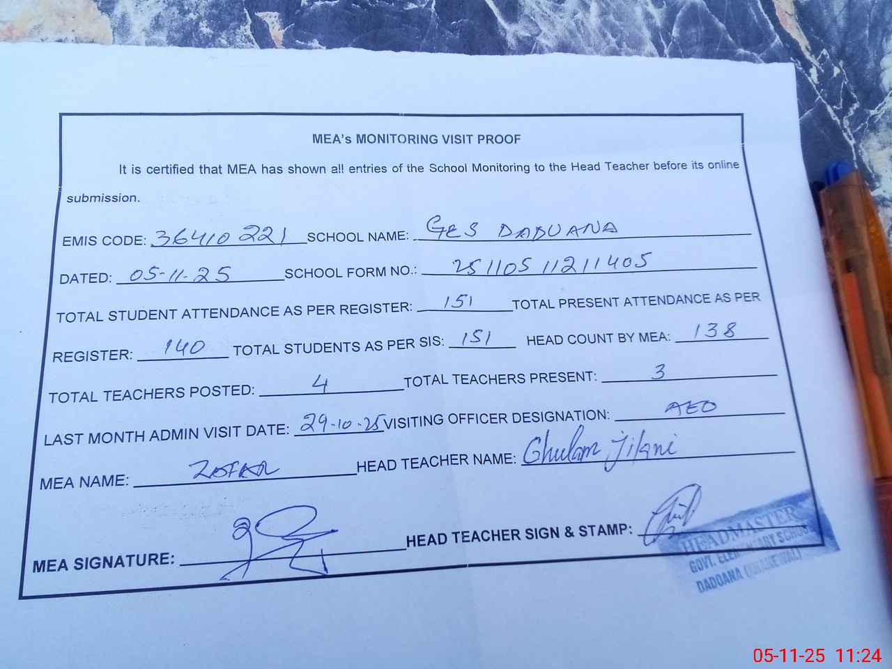 | Attendance Register | Head Teacher | MEA with School | Visit Proof |