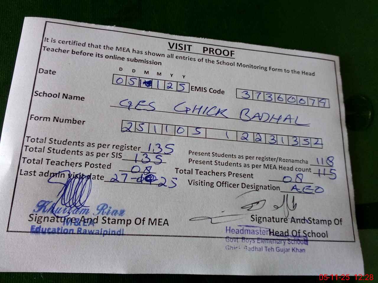 | Attendance Register | Head Teacher | MEA with School | Visit Proof |