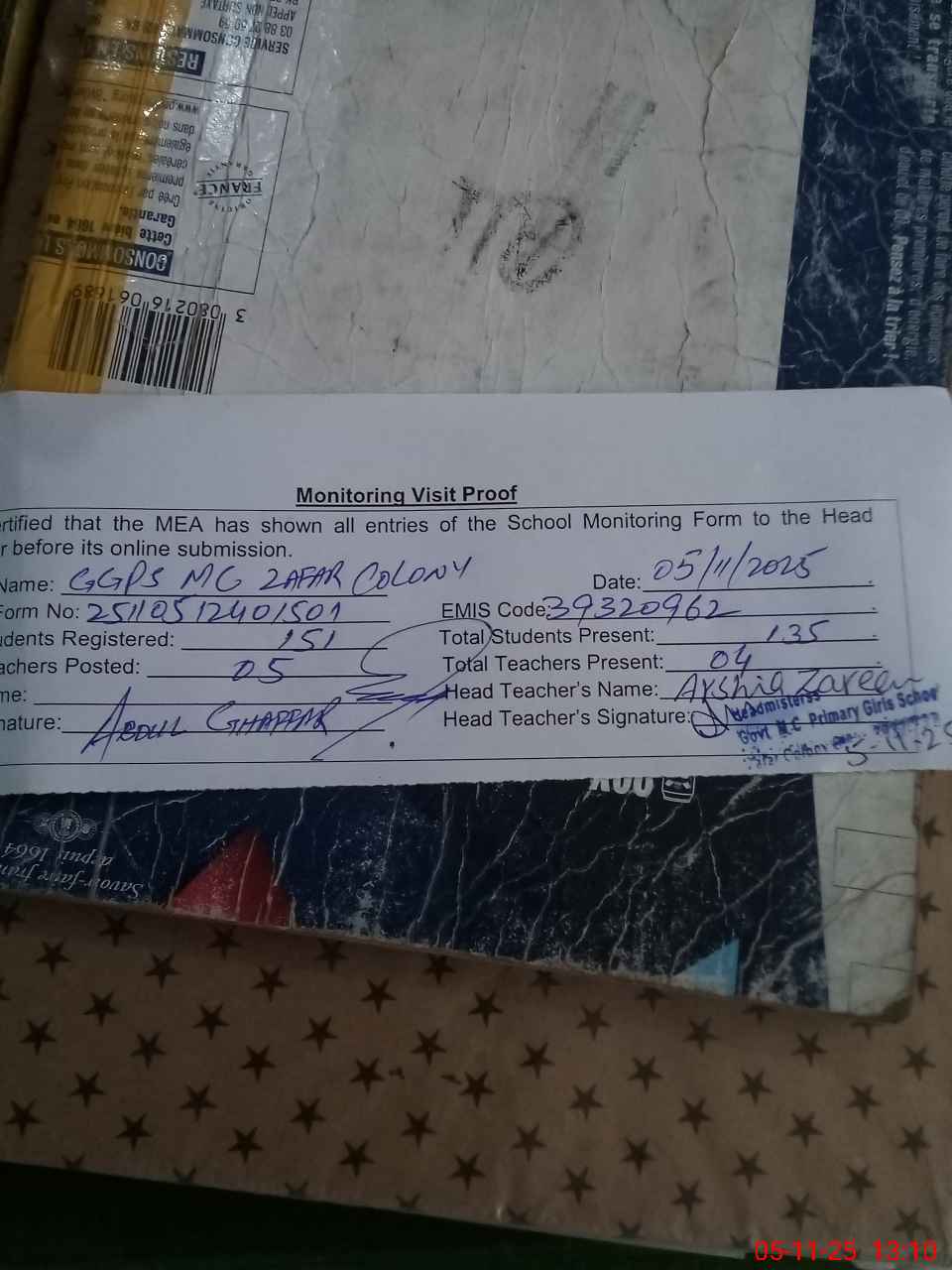 | EMIS Code: 39320962 | Name of School: GGPS MC ZAFAR COLONY | |||