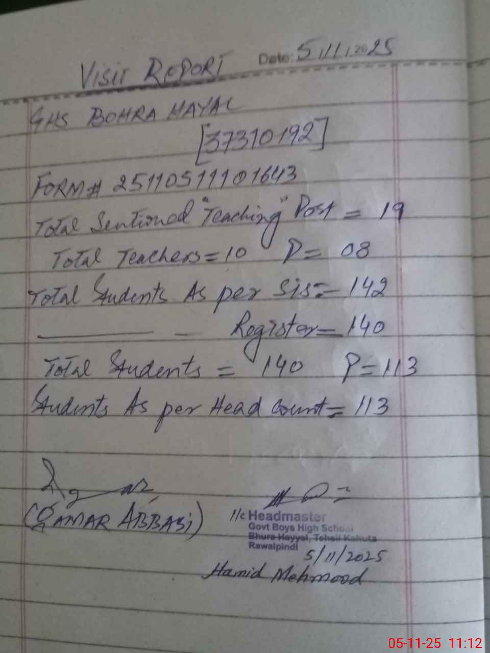 | Attendance Register | Head Teacher | MEA with School | Visit Proof |