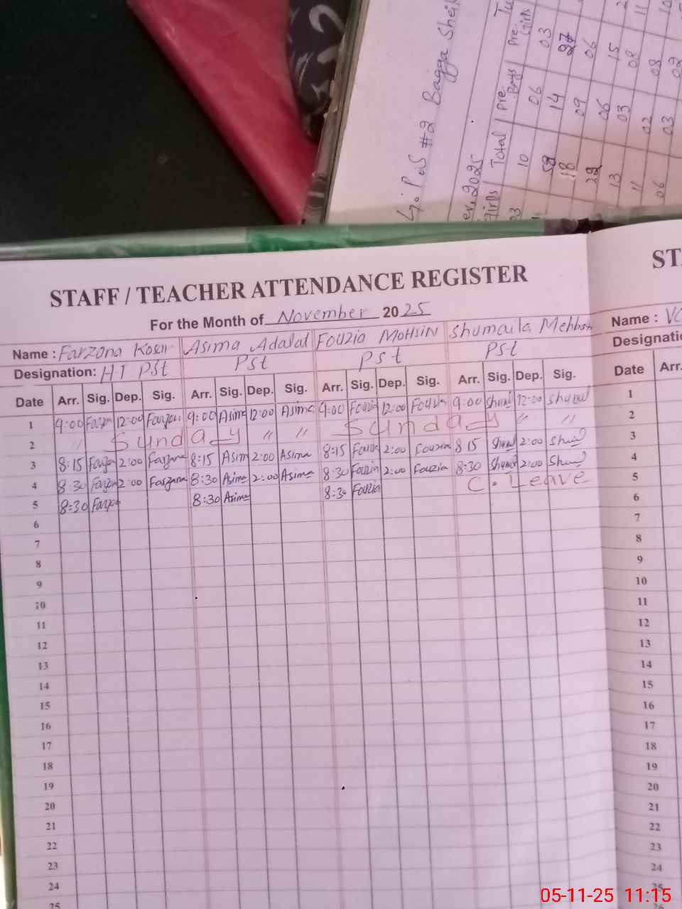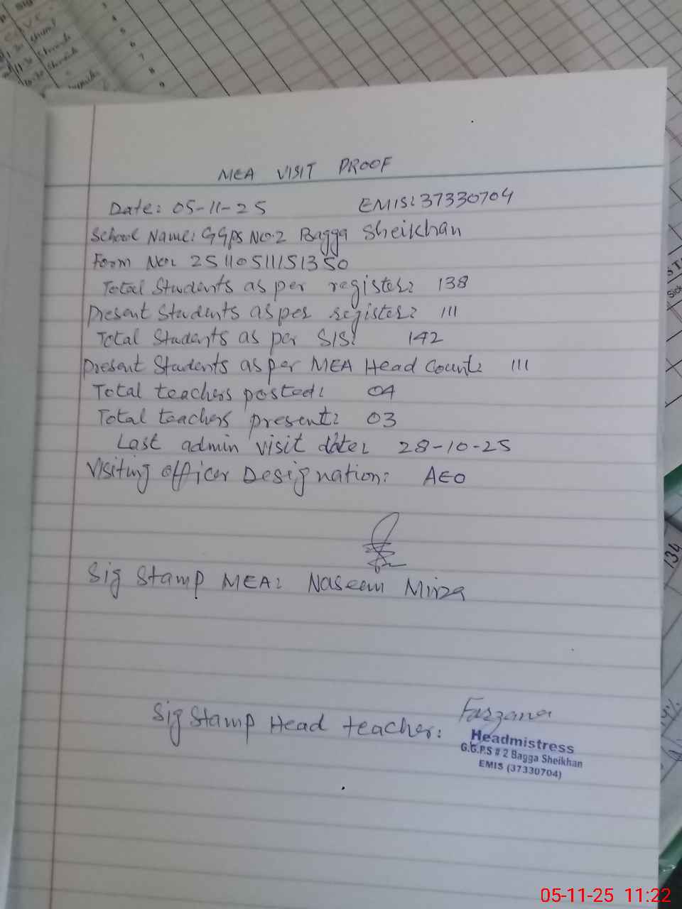 | Attendance Register | Head Teacher | MEA with School | Visit Proof |